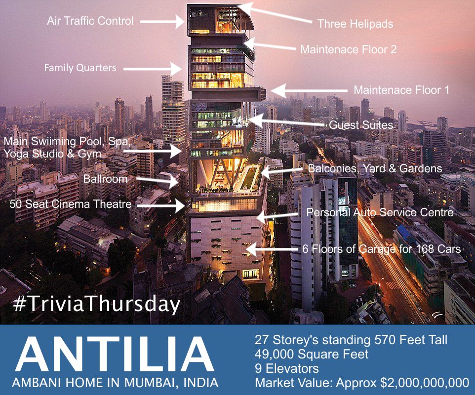 A M Luken Insurance On Twitter Triviathursday Most Expensive Private Residence Mukesh Ambani S Antilia In Mumbai A 27 Floor Home 49k Sqft Estimated Value Of 2b Https T Co 3ccsasdbtj