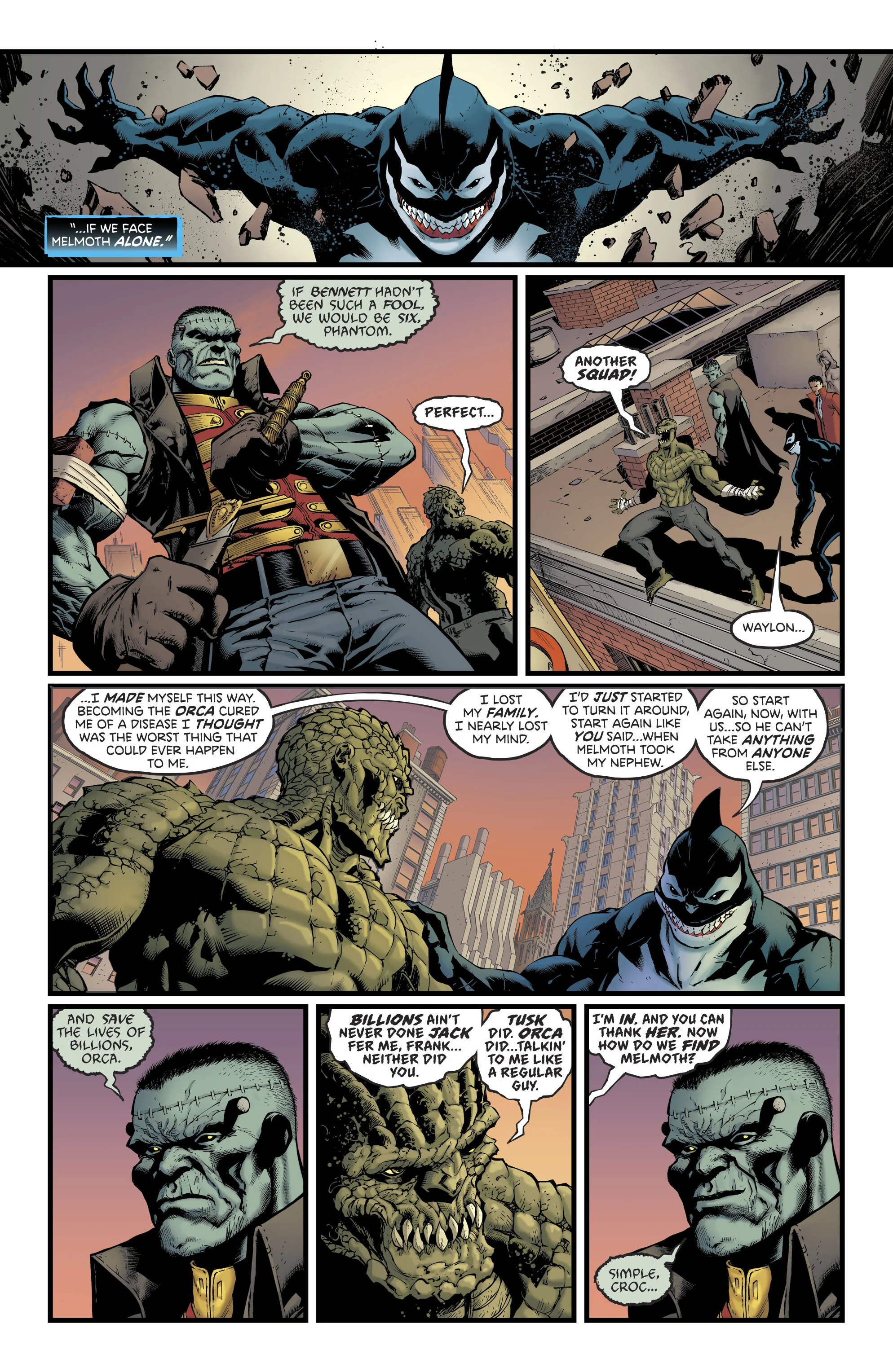 The truck crashes inside gotham and the experiments are freed venturing into the city on their own. So frankenstein heads to gotham city in search of allies and recruits killer croc lady clayface orca and vampire andrew bennett.