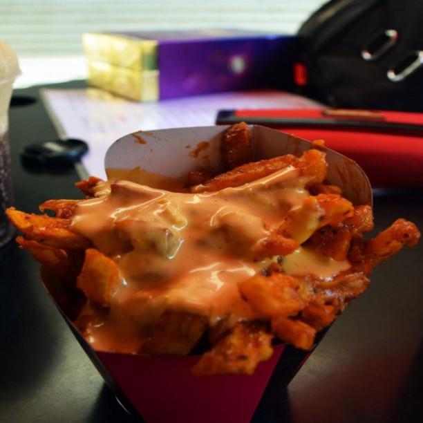 The j address the j location. Famoso per cheese fries in a wok like box.